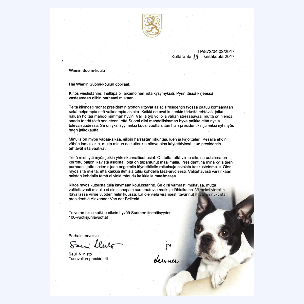 Wienin Suomi-koulun lukuvuoden 2016-2017 koululaisryhmän oppilaat kirjoittivat tasavallan Presidentille Sauli Niinistölle vuosi sitten. He olivat Suomi-koululla Pirre-open kanssa miettineet, mitkä asiat heitä kiinnostavat presidentin työssä. Mielenkiintoisia kysymyksiä syntyikin melkoinen määrä ja ne lähetettiin Suomeen presidentin kansliaan. Sauli Niinistö olikin todella ystävällinen ja vastasi koululaisten keksimiin kysymyksiin.